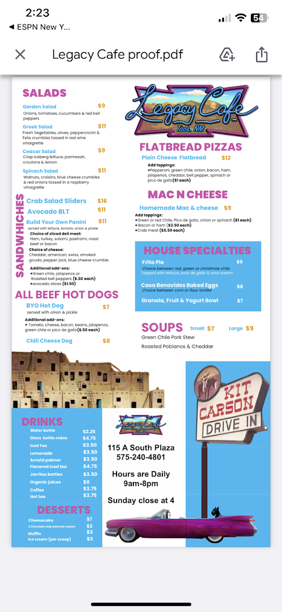 Welcome to Legacy Café, a charming eatery nestled in Taos, NM. This delightful café boasts a diverse menu that caters to all tastes and dietary preferences. Start your meal with a refreshing Greek Salad or indulge in the hearty Spinach Salad for just $11.00. For those craving comfort food, the café's renowned homemade mac 'n' cheese is a must-try, alongside delectable Crab Salad Sliders priced at $16.00.